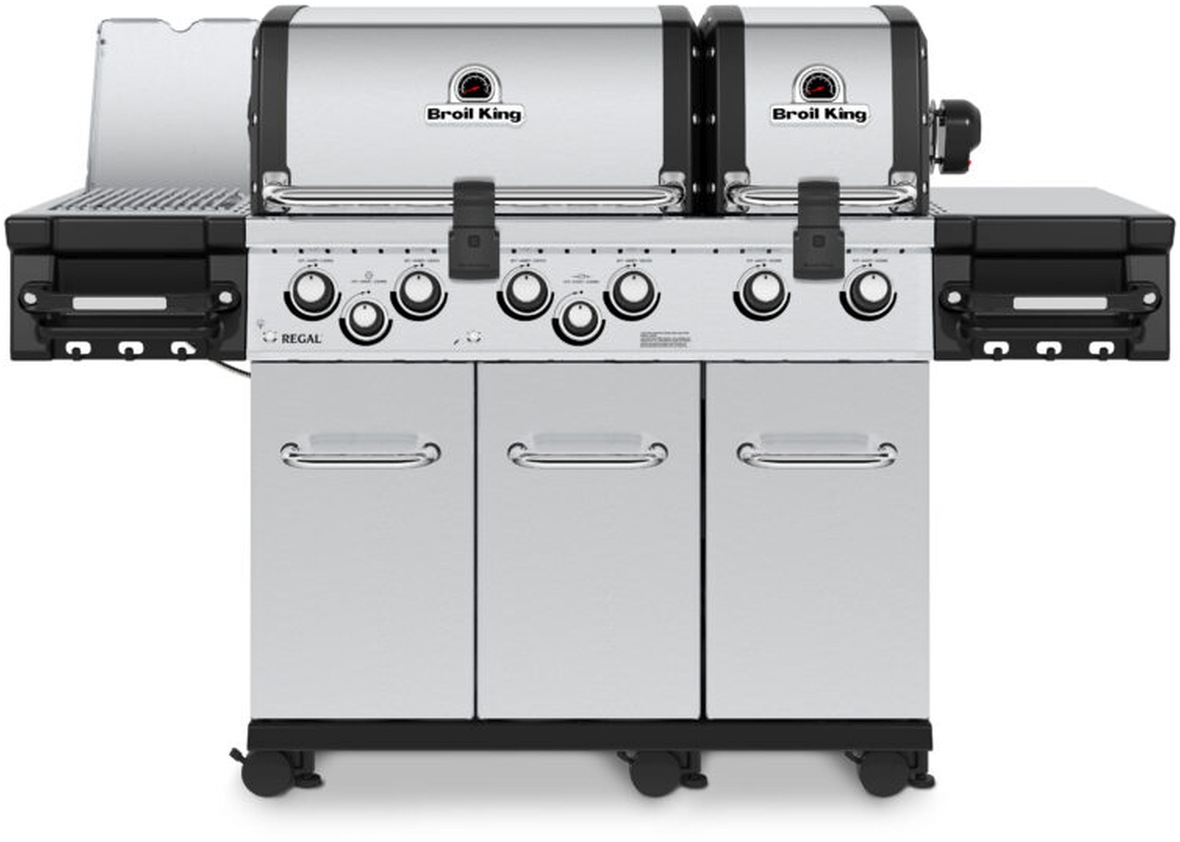 The Regal™ S 690 Pro IR features two totally independent ovens with a total of 750 sq. in. of cooking space including two stainless steel warming racks, four solid 9 mm stainless steel cooking grids, 2 reversible heavy-duty cast iron cooking grids, stainless steel Flav-R-Wave™ cooking system, 6 stainless steel Dual-Tube™ burners, stainless steel side shelves, an enclosed cabinet base and built-in control knob lights.