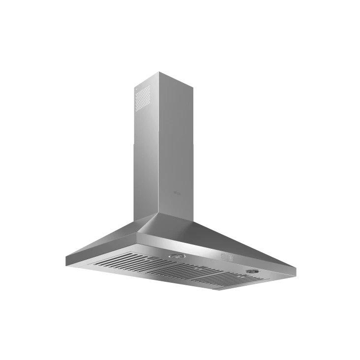 Bolsena with its pyramid shaped angles and stainless steel finish, makes a striking visual statement to any kitchen. Available in 30” or 36” widths, features backlit touch controls, LED lightning and a 4 speed blower. It also features a telescopic chimney for up to 9’ 1” ceilings. Designed for standard ducted installation it can also be installed as a recirculating system using the kit available as an accesory.Read More