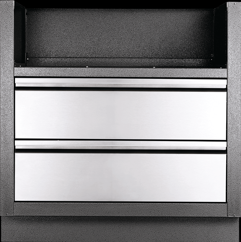 Specially made for the Built-In 700 Series 32" Gas Grill Heads, this carbon coloured, powder coated, galvanneal cabinetry features increased durability from the two-coat pebbling finishing system. Two stainless steel drawers are mounted on smooth gliding tracks for under grill storage. Installation is a breeze with knockouts for gas and electrical. Levelling feet ensure a balanced surface, even if your patio isn't perfectly level. Partner this cabinet with the Built-In 700 Series 32" Gas Grill Head and the perfect OASIS™ cabinets for a custom outdoor grilling OASIS™.