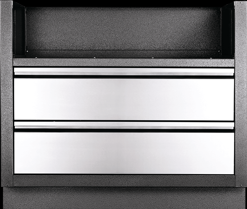 Specially made for the Built-In 700 Series 38" Gas Grill Heads, this carbon coloured, powder coated, galvanneal cabinetry features increased durability from the two-coat pebbling finishing system. Two stainless steel drawers are mounted on smooth gliding tracks for under grill storage. Installation is a breeze with knockouts for gas and electrical. Levelling feet ensure a balanced surface, even if your patio isn't perfectly level. Partner this cabinet with the Built-In 700 Series 38" Gas Grill Head and the perfect OASIS™ cabinets for a custom outdoor grilling OASIS™.