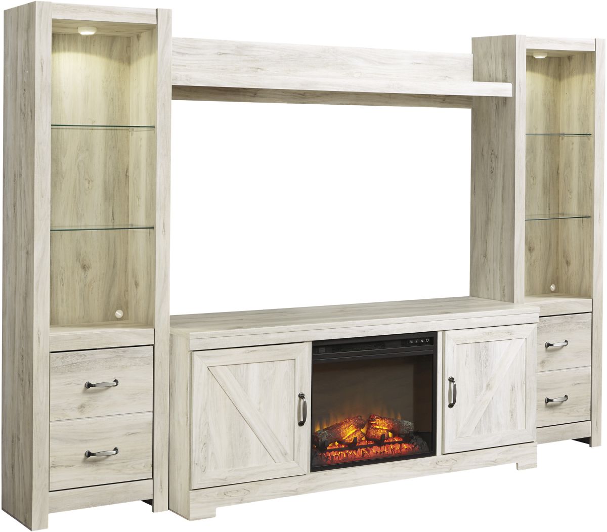 Express your farmhouse style with this entertainment center. Wispy white finish over replicated oak wood grain is a delightful change from the ordinary. Clean-lined, classic styling with barn door inspiration provides a country chic aesthetic that’s a breath of fresh air. Combination of cabinet storage and open display space with LED lighting makes for just the right mix. What really turns up the heat: an electric infrared fireplace insert with faux firebrick surround that operates with or without infrared heat and includes a multi flame feature, 7-level temperature setting, five brightness levels and LED glowing embers effect.