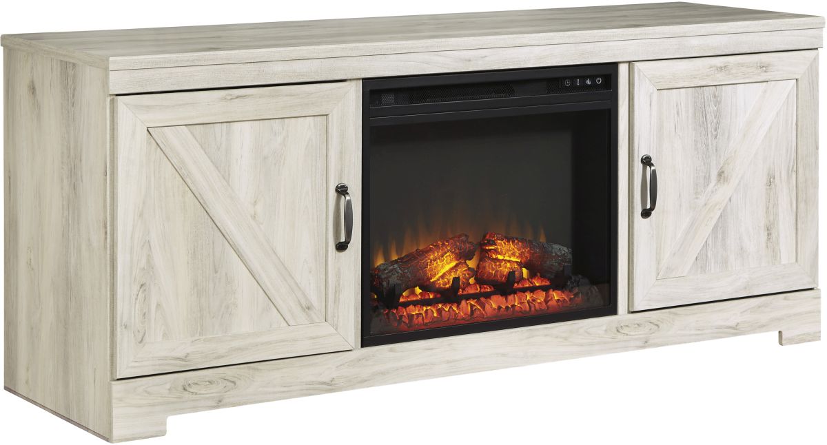 Express your farmhouse style with this TV stand with fireplace insert. Wispy white finish over replicated oak wood grain is a delightful change from the ordinary. Clean-lined, classic styling with barn door inspiration provides a country chic aesthetic that’s a breath of fresh air.Read More