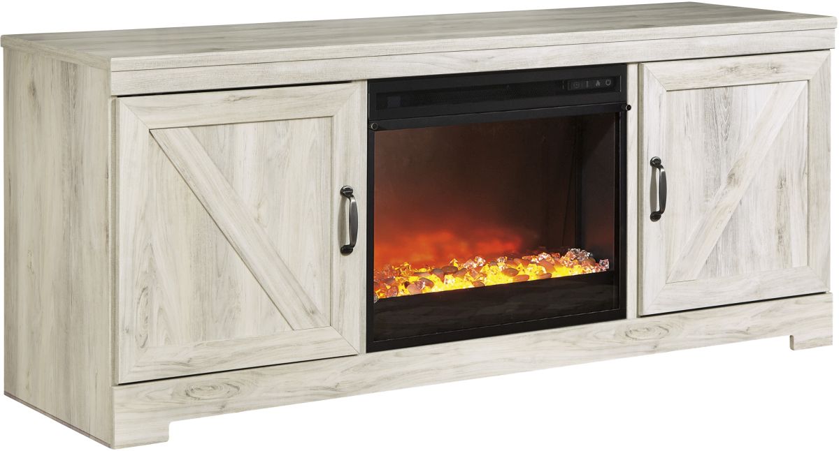 Express your farmhouse style with this TV stand with fireplace insert. Wispy white finish over replicated oak wood grain is a delightful change from the ordinary. Clean-lined, classic styling with barn door inspiration provides a country chic aesthetic that’s a breath of fresh air. Adding that much more show-stopping style: an LED fireplace insert that operates with or without heat and includes a six-level temperature setting, remote control and overheating control for added safety. The fireplace insert comes with optional faux glass crystals and natural stones, so you can customize the look of the flame bed.