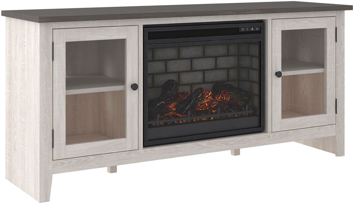 With its two-tone finish and minimalist charm, this TV stand with fireplace option is right in tune with your relaxed approach to high style. Beautifully made to accommodate your media equipment, it’s well equipped with adjustable shelving, cutouts for wire management and a pair of glass-front doors that enhance the clean-lined aesthetic. The look is ideal for modern farmhouse and contemporary settings.